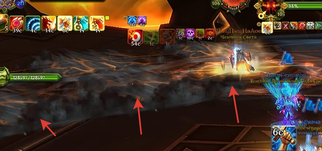 Далее Иранох кастует умение “Ударная волна” которая направляется за игроком напрямую (наносит большой урон) , волна останавливается на первом встречном игроке (соответственно прячемся от этой волны за танком)