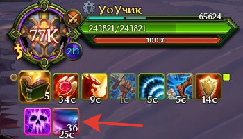 Наносит урон (стоит нажимать защиту) и по всему периметру расстилается пелена тьмы, которая наносит летальный урон.