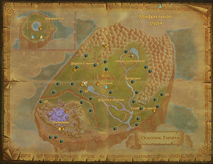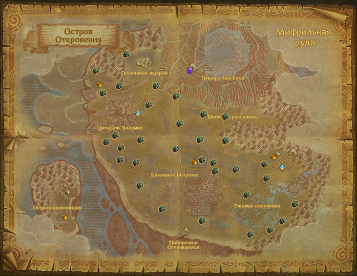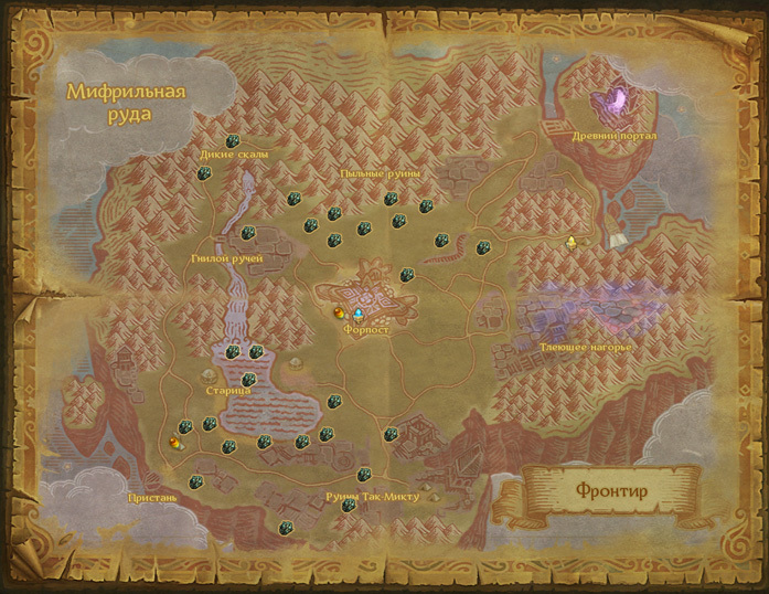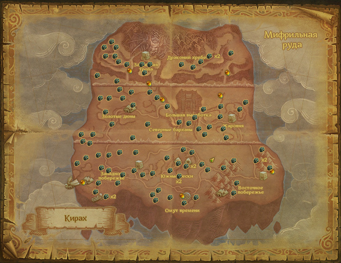 Сбор Мифрильной руды куда более интересен из-за обилия локаций, в которых она существует в адекватном количестве. Если вы прокачиваете профессию параллельно с уровнем персонажа, вам вообще не стоит беспокоиться и целенаправленно бегать по локациям - все само найдется по пути. В противном случае рекомендуется прокачать профессию до 39 уровня и сделать круг по Кираху.