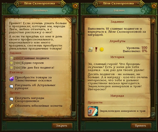 После достижения 100-го уровня на P2P серверах появляется квест Славные подвиги. Его можно взять у Затейниц в столице фракции.