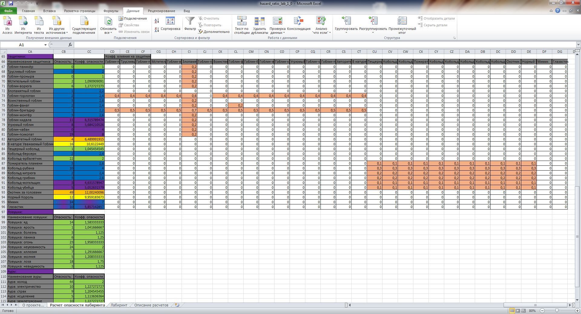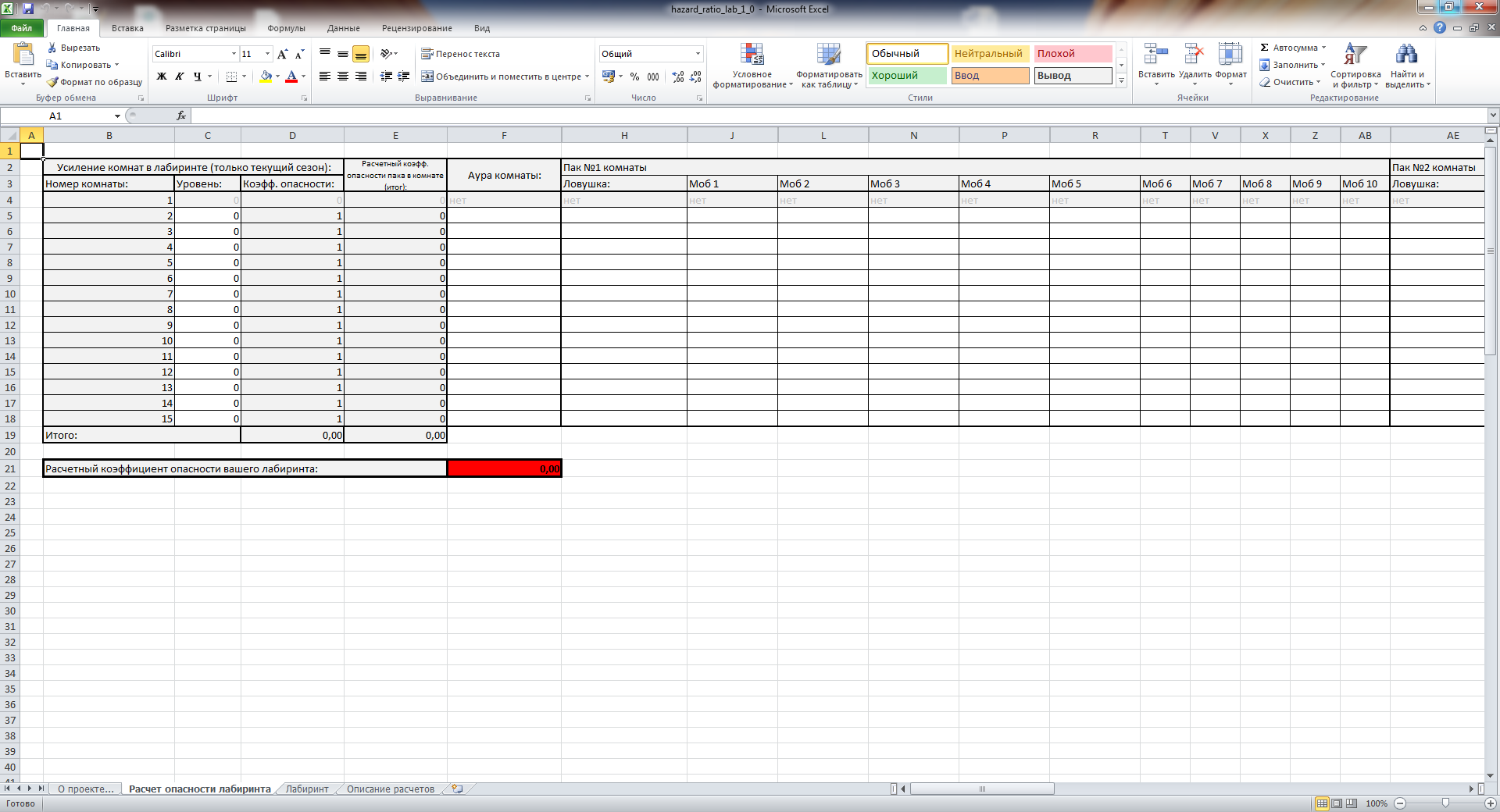 Предлагаемый вашему вниманию файл (ССЫЛКА) - это альтернативный расчет "опасности лабиринта" на основе указанных показателей (количество комнат, усиление за золото, защитники, ауры/ловушки) и на основании опросов на форуме Аллодов Онлайн (рейтинги опасности ловушек, аур и защитников). Единственное, что не принимается в расчет - усиление за ГС, т.к. серьезный лабиринт всегда имеет "Непобедимых" защитников!