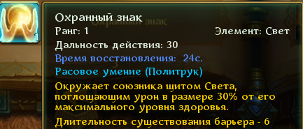 3) В целом, что это вообще за расовая абилка с кд 24 секунды? Кроме того, она, как расовая, идет вне гкд, и это то, что можно было бы поднерфить у жреца в обмен на ап в чем-то другом. То что путеводка идет вне гкд - это интересно, да. То, что огражд. слово идет вне гкд - это логично, ведь это аналог щитов других классов (типа астрального тела), такие абилки обычно идут вне гкд. Почему охранный знак идет вне гкд - я не вижу никаких причин. С таким же успехом какой-то ореол мог бы быть вне гкд.