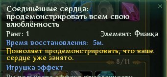 а суть в том, что бы показать что вы влюблены, а влюблены вы не можете быть всегда, но как вариант, можно было бы отменять время у игрушки, если вы обвенчались(и возвращать время, если расторгли брак), или находитесь в группе с противоположным полом персонажа, или дружите с противоположным полом, но на время дружбы поделились друг с другом "симпатией"(пункт в меню друзей: "симпатия"), и в вашу "сердечную связь", через "симпатию", никто влезть не может(пока не разорвёте дружбу, а потом по новой), а кто попытается влезть в "сердечную связь", будет написано: "уже связан(а), попробуйте с другим(другой)" и "сердечную связь" в дружбе, можно было бы делать даже находясь в браке, это бы называлось: "флирт на стороне", но с кем-то одним(одной)) !!!