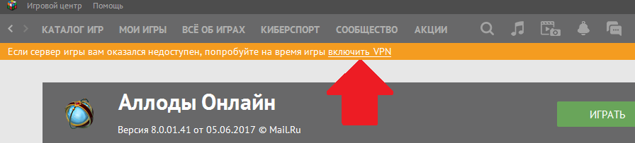 Имелось в виду "попробуй зайти через launcher", в смысле без игрового центра. В папке аллодов папка bin, и в ней Launcher.exe. По крайней мере в Киеве далеко не все провайдеры блокируют Mail.ru настолько жёстко, что не запускается не только игровой центр, но и Launcher, и игровые сервера (мой - блокирует и то, и другое, но мой и с Днём Победы 8 мая поздравлял - повезло мне). Да, обновляться надо, скорее всего, через Игровой Центр, но обновлять можно через VPN.