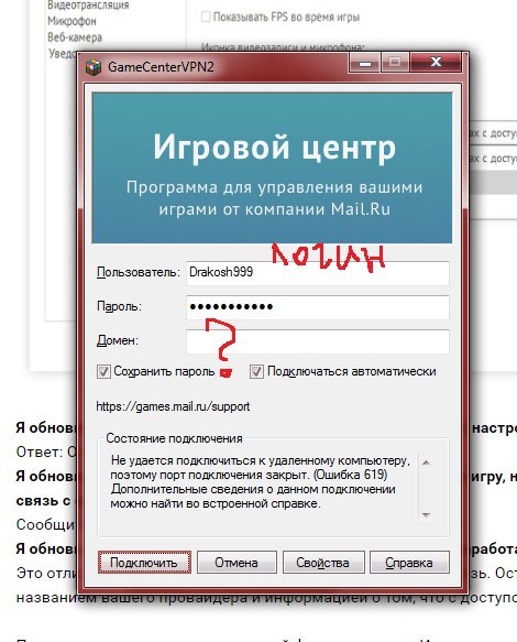 ...Вот только не подключается. Вот скрин. Все правильно делаю? Или вместо логина игры писать адрес эл.почты? В домен прописывать что-то?
