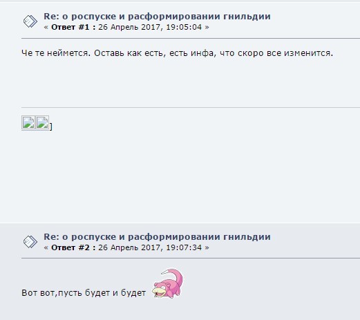 Больше 3-х месяцев висела объява о возможном роспуске гни. Время было. Свое слово я держу. Никто из состава гильдии ничего за 3 месяца не предложил. Играть сам уже не планирую, так что, как и писал что удалю, вот и удалил.