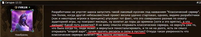 Разработчики не упустят шанса запустить такой лакомый кусочек под названием "Классический сервер", тем более, когда другой небезызвестный проект весьма удачно стартовал, однако, видимо разработчики (как и некоторые игроки в принципе) упускают тот факт, что это совершенно разные по охвату аудиторией игры, ну поиграют месяцок, ну взлетит до поры до времени (хотя и это врятли), а что дальше? Какой путь развития? Я не вижу смысла открывать классические сервера, не вернуть уже то, что было когда-то, люди может и вернуться поностальгировать, и то не на долго, есть ли смысл открывать "второй варп", зачем тратить ресурсы и силы в пустую? Откуда такая уверенность что классические сервера взлетят? Мне просто интересно..