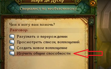 Есть такая умелка - "память воплощений". Из описания "Открывает окно выбора умений воплощений, в котором можно быстро изучить новые умения без визита к специалисту по необъяснимому". После выбора получаем - "Необходимо говорить со специалистом по необъяснимому".