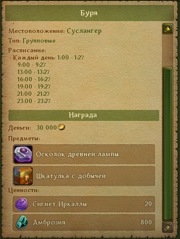 Буря — это событие на аллоде Суслангер, которое появилось в обновлении 12.0 под названием «Грёзы пустыни». Сейчас оно входит в список заданий Иркаллы, которые нужно выполнить, чтобы получить её Сигнеты. Также участие в буре позволяет дополнительно добывать амброзию, которая необходима для покупки на Суслангере различных костюмов, питомцев и маунтов.