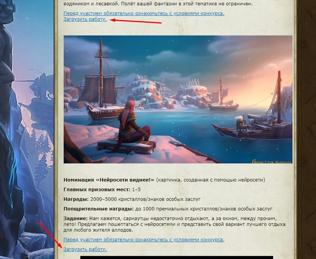 Перейди на главную страницу и там будет ссылка на конкурсное описание. По кнопке загрузить работу ты попадешь либо в альбом группы ВК, либо на форумные темы, куда будут выкладывать работы. Ну и остальными позициями также там указано.